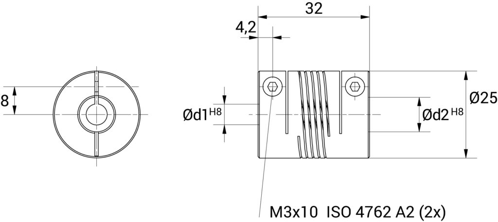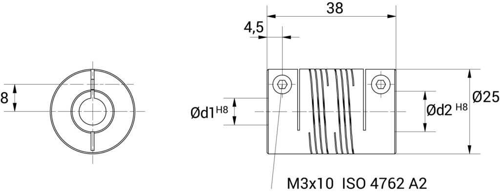 | Grandezza | Diametro esterno | Lunghezza | Posizione vite | Posizione grano | Filetto vite | Filetto grano | Quota S | Combinazioni fori standard d1 H8 / d2 H8 |
