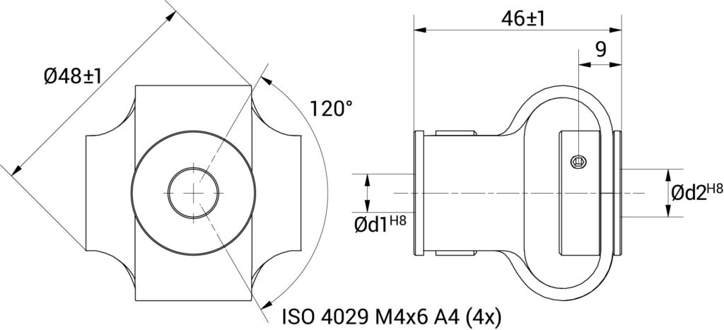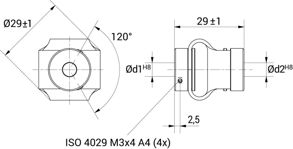 | Grandezza | Diametro esterno | Lunghezza | Posizione grano | Filetto grano | Combinazioni fori standard d1 H8 / d2 H8 |
