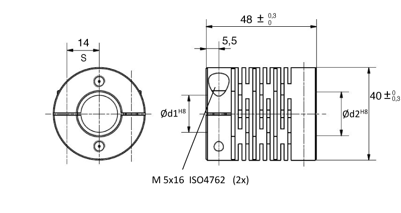 | Grandezza | Diametro esterno | Lunghezza | Filetto vite | Posizione vite | Quota S | Combinazioni fori standard d1 H8/ d2 H8 |