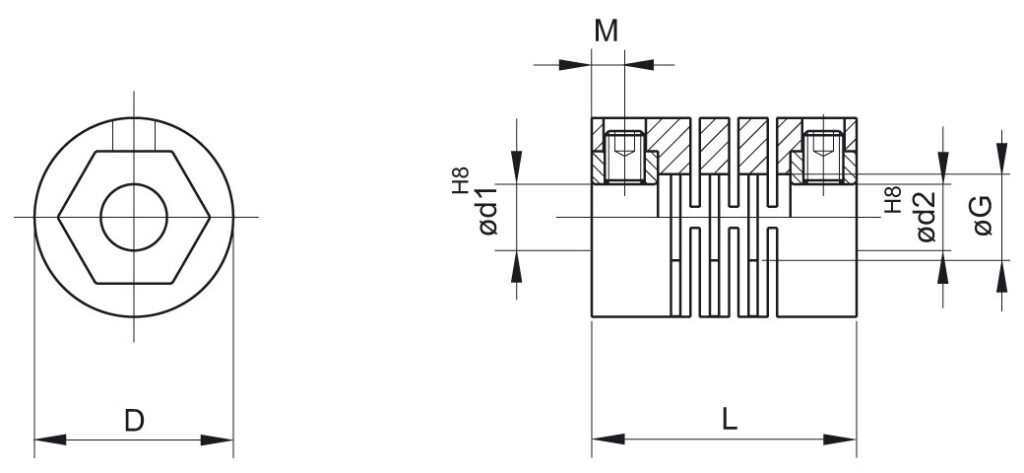| Grandezza | Diametro esterno | Lunghezza | Posizione grano | Filetto grano | Combinazioni fori standard d1 H8/ d2 H8 |