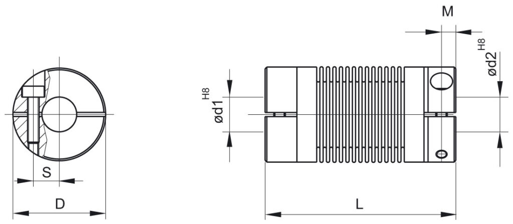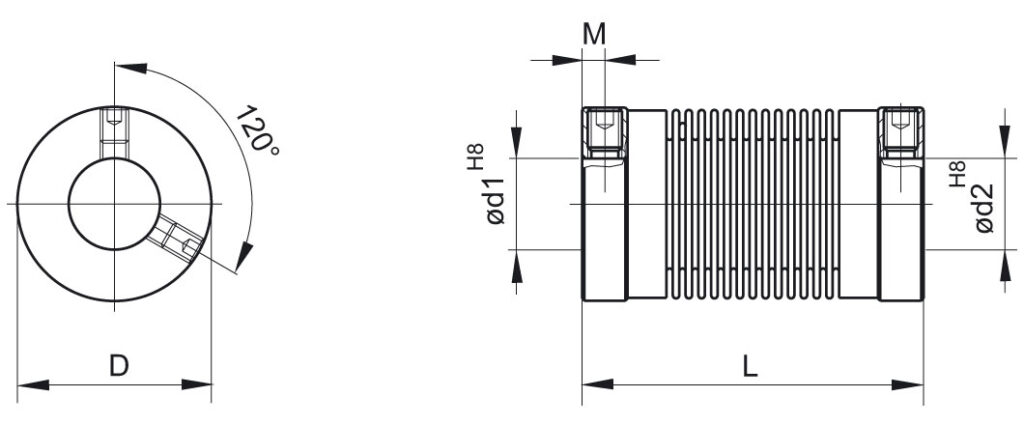 Giunto realizzato da due mozzi in alluminio anodizzato con soffietto speciale in nichel. Buona capacità di correggere errori di disallineamento, elevata rigidità torsionale. Assenza di gioco ed assenza di vibrazioni. Ottimo nei sistemi di misura. Disponibile la versione in acciaio inox. Possono lavorare a temperature comprese tra -30 °C e +120 °C. I dati tecnici sottoriportati sono validi per sollecitazioni uniformi. In caso contrario, contattare il nostro ufficio tecnico. Disponibile con sistema di serraggio a grani e vite.