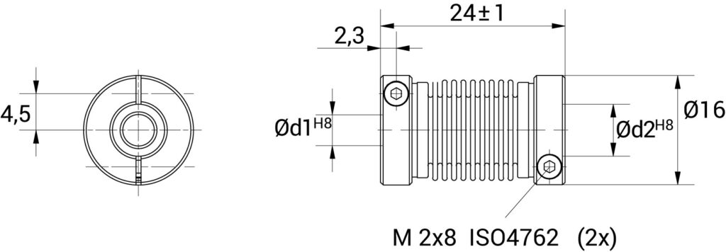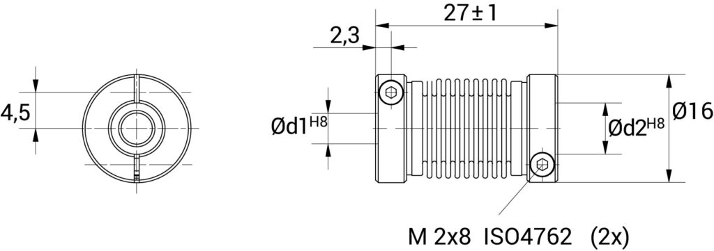 Dati Tecnici | Velocità max. | Coppia max. | Disallineamento radiale max. | Disallineamento assiale max. | Disallineamento angolare max. | Rigidità torsionale | Rigidità radiale | Momento d'inerzia | Coppia di serraggio max. | Range temperatura d’utilizzo | Peso | Materiale mozzi | Materiale soffietto | |