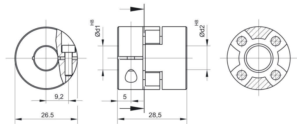 | Grandezza | Diametro esterno | Lunghezza | Posizione grano | Filetto grano | Combinazioni fori standard d1 H8 / d2 H8 |